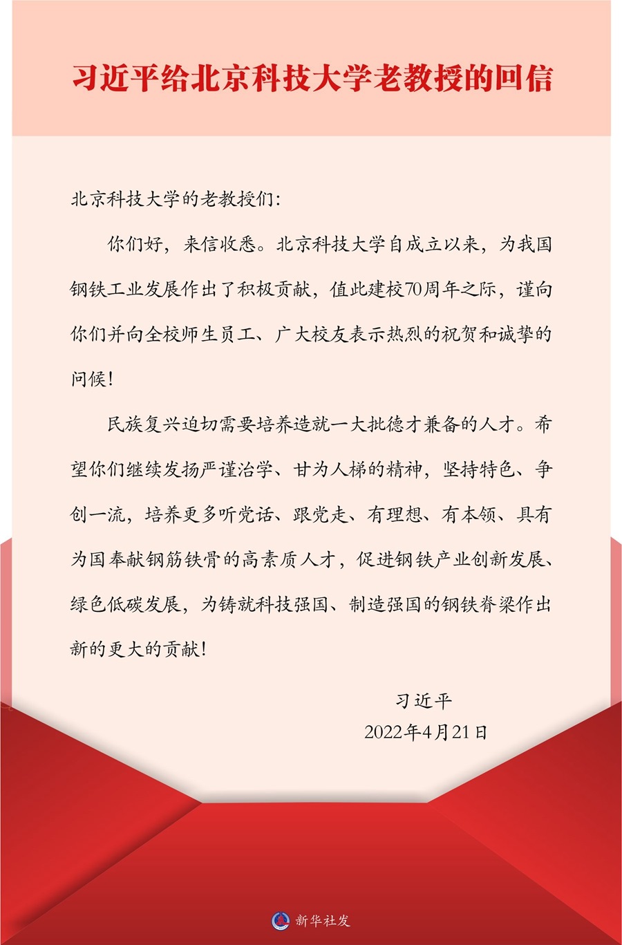 中共中央總書記、國家主席、中央軍委主席習(xí)近平4月21日給北京科技大學(xué)的老教授回信,對培養(yǎng)更多高素質(zhì)人才,促進鋼鐵產(chǎn)業(yè)創(chuàng)新發(fā)展、綠色低碳發(fā)展提出殷切期望。