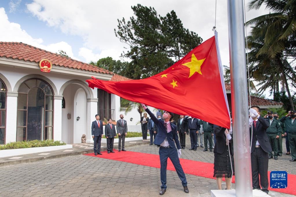 在尼加拉瓜首都馬那瓜舉行的中國(guó)駐尼加拉瓜大使館復(fù)館儀式上,五星紅旗伴隨著《義勇軍進(jìn)行曲》冉冉升起(2021年12月31日攝)。新華社記者 辛悅衛(wèi) 攝