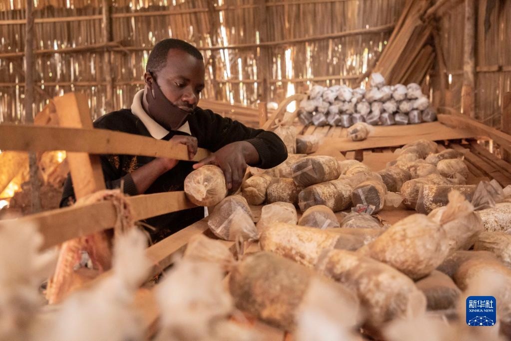 在盧旺達(dá)首都基加利的一家食用菌培育作坊,作坊主人埃馬紐埃爾·阿希馬納檢查菌袋(2020年9月9日攝)。中國(guó)福建農(nóng)林大學(xué)的菌草專(zhuān)家2006年來(lái)到盧旺達(dá)開(kāi)始菌草技術(shù)合作項(xiàng)目,在當(dāng)?shù)厥痉逗屯茝V菌草技術(shù)。新華社發(fā)(西里爾·恩德格亞攝)