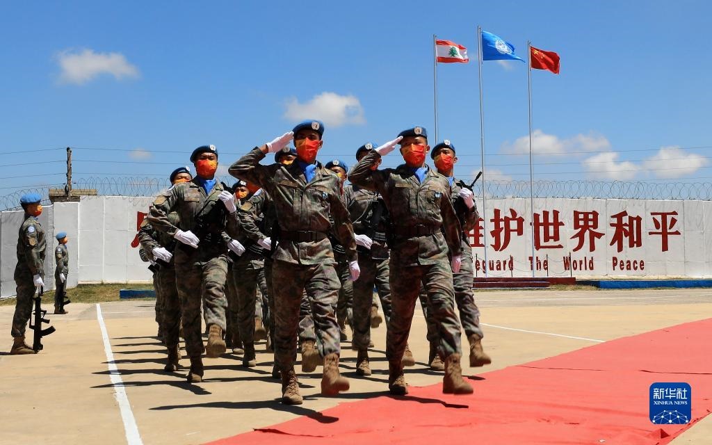 在黎巴嫩南部辛尼亞村的中國(guó)維和部隊(duì)營(yíng)區(qū),中國(guó)維和部隊(duì)官兵在受勛后通過(guò)觀禮臺(tái)(2022年7月1日攝)。新華社記者 劉宗亞 攝