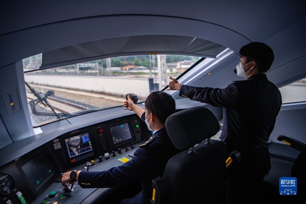 列車(chē)司機(jī)駕駛復(fù)興號(hào)列車(chē)行駛在中老鐵路上(2022年6月1日攝)。新華社記者 江文耀 攝