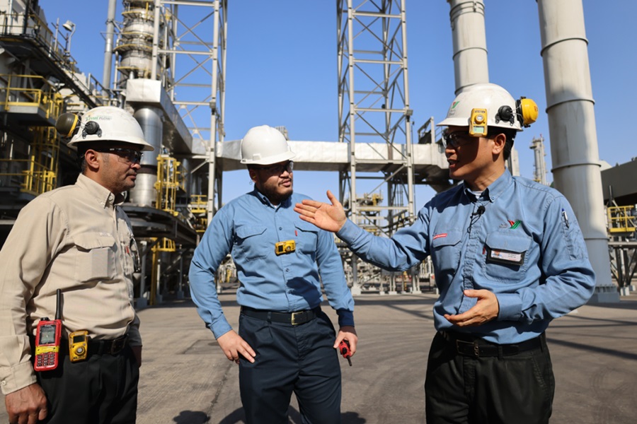 2022年11月27日,在沙特西部城市延布,中沙延布煉廠的員工在交流。總投資86億美元的中沙延布煉廠是中國石化與沙特阿拉伯石油公司合資興建的項(xiàng)目,自2016年1月20日由兩國元首共同啟動(dòng)投產(chǎn)以來,發(fā)展迅速。今年1月至8月累計(jì)實(shí)現(xiàn)利潤11.5億美元。