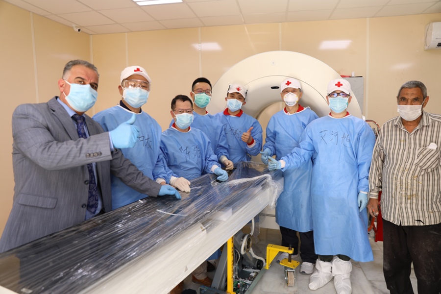 2020年4月12日,在伊拉克首都巴格達(dá),援助伊拉克防治新冠肺炎的中國醫(yī)療專家將CT設(shè)備搬運(yùn)到機(jī)房后與伊方人員合影。
