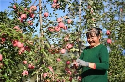 2022年10月,在陜西延安南溝村果園,習(xí)近平總書(shū)記同老鄉(xiāng)們親切交流,并采摘了一個(gè)紅紅的大蘋(píng)果。