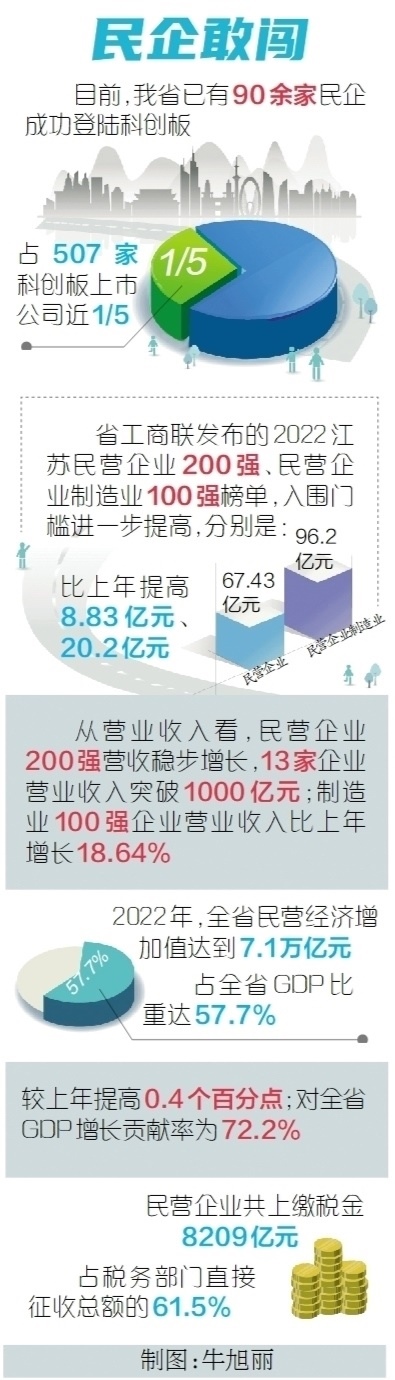 勇立實業(yè)潮頭,爭當(dāng)奮楫搏浪的“水手”,另一份榜單同樣能佐證江蘇民企的勇毅前行。去年9月,省工商聯(lián)發(fā)布2022江蘇民營企業(yè)200強、民營企業(yè)制造業(yè)100強榜單,入圍門檻進一步提高,分別達67.43億元、96.2億元,比上年提高8.83億元、20.2億元。從營業(yè)收入看,民營企業(yè)200強營收穩(wěn)步增長,13家企業(yè)營業(yè)收入突破1000億元;制造業(yè)100強企業(yè)營業(yè)收入比上年增長18.64%。