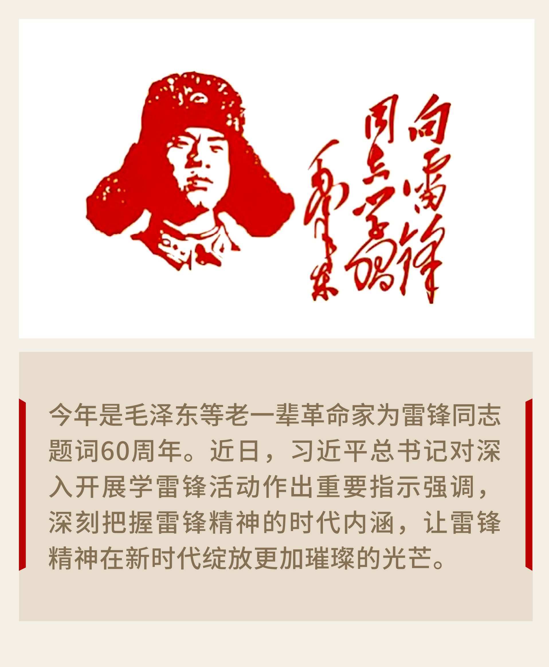 1963年3月5日,毛澤東“向雷鋒同志學(xué)習(xí)”題詞發(fā)表。隨后,劉少奇、周恩來、朱德、鄧小平等老一輩革命家也相繼題詞,發(fā)出學(xué)習(xí)雷鋒的偉大號召。