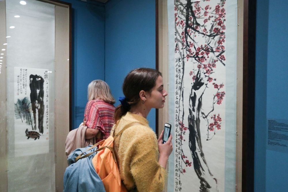 △觀眾在希臘雅典塞奧哈拉基斯藝術(shù)基金會(huì)美術(shù)館觀看中國(guó)的藝術(shù)展。
