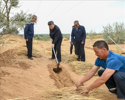 △2019年8月21日,正在甘肅考察的習(xí)近平總書記來到古浪縣八步沙林場。考察中,他拿起一把開溝犁,參與到治沙勞動中。