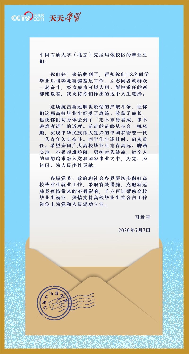 2020年畢業(yè)季,中國(guó)石油大學(xué)(北京)克拉瑪依校區(qū)118名即將到新疆基層就業(yè)的大學(xué)生,在離開(kāi)母校之際,給習(xí)近平總書(shū)記寫(xiě)信匯報(bào)了大學(xué)四年學(xué)習(xí)和思想上的收獲,表達(dá)了立志同各族群眾一起奮斗、建設(shè)美麗邊疆的決心。