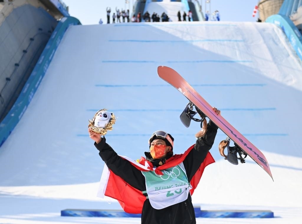 這是2022年2月15日,中國(guó)選手蘇翊鳴在北京2022年冬奧會(huì)單板滑雪男子大跳臺(tái)決賽奪冠后慶祝。新華社記者 黃宗治 攝
