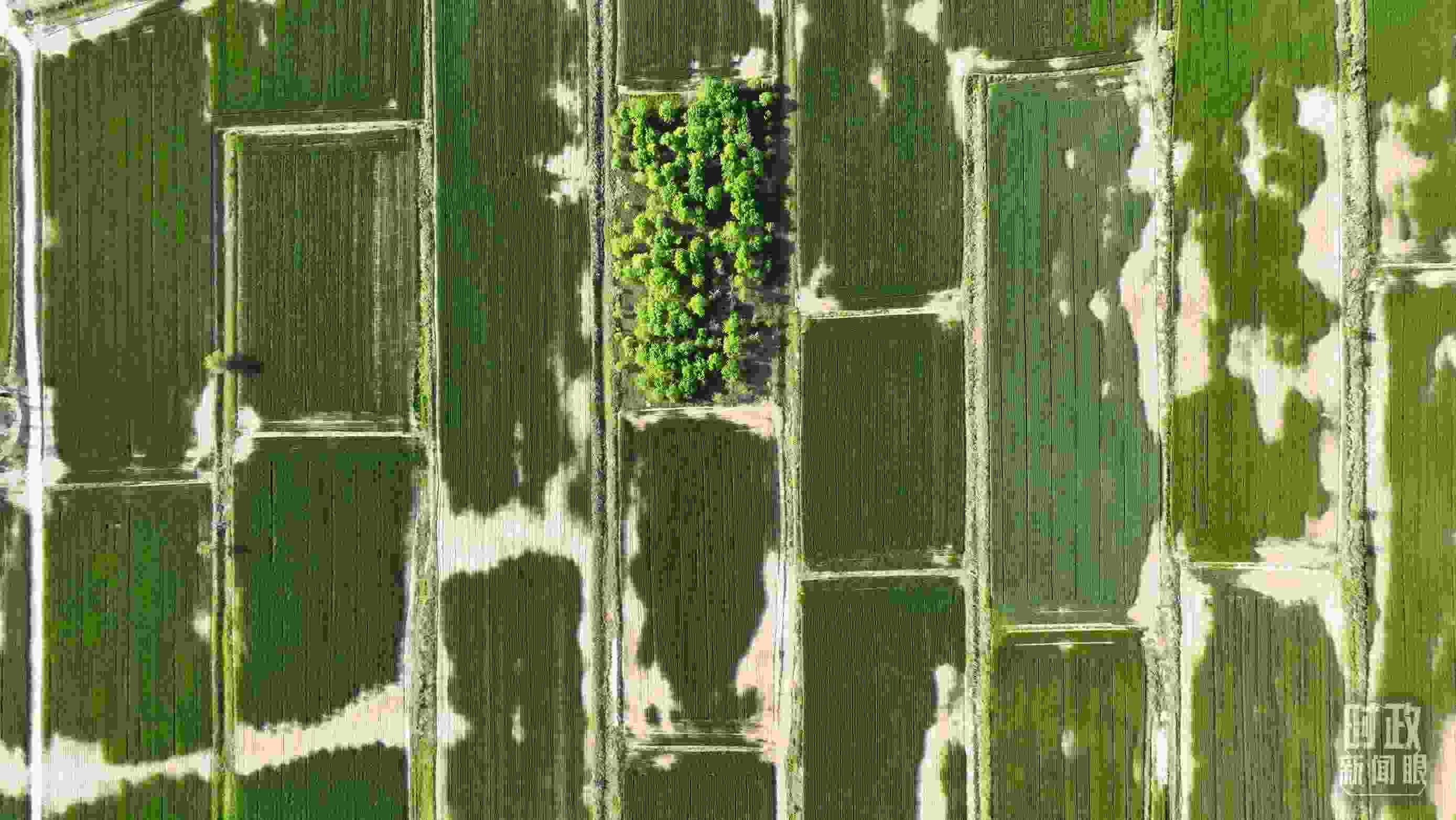 △旱堿麥田被分割成整齊劃一的綠色方塊。(總臺(tái)記者郭永良拍攝)
