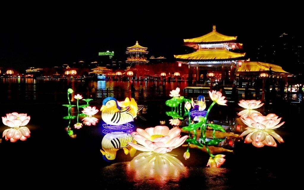2023年1月24日在西安大唐芙蓉園拍攝的花燈(無人機照片)。新華社記者 劉瀟 攝