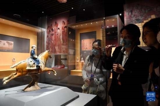 西安博物院,鎮(zhèn)館之寶唐代三彩騰空馬吸引著中外游客頻頻駐足定睛。萬(wàn)里云山躍馬度。胡人少年高鼻深目,策馬騰空,一路疾馳,追夢(mèng)長(zhǎng)安。