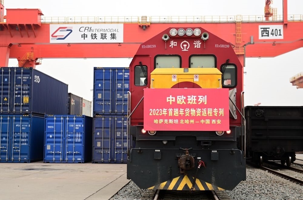 滿載著來自哈薩克斯坦1300噸面粉的中歐班列抵達西安國際港站(1月13日攝)。新華社記者 李一博 攝