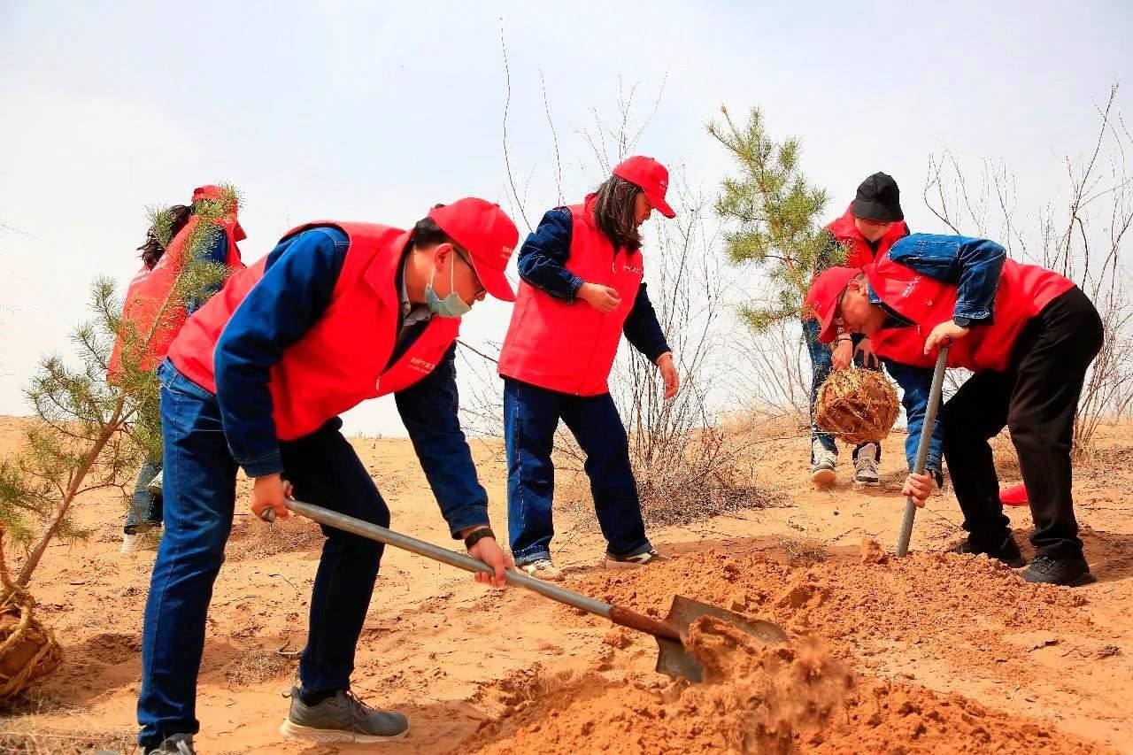 △2023年4月12日,志愿者在寧夏靈武白芨灘國(guó)家級(jí)自然保護(hù)區(qū)開(kāi)展義務(wù)植樹(shù)、扎草方格。