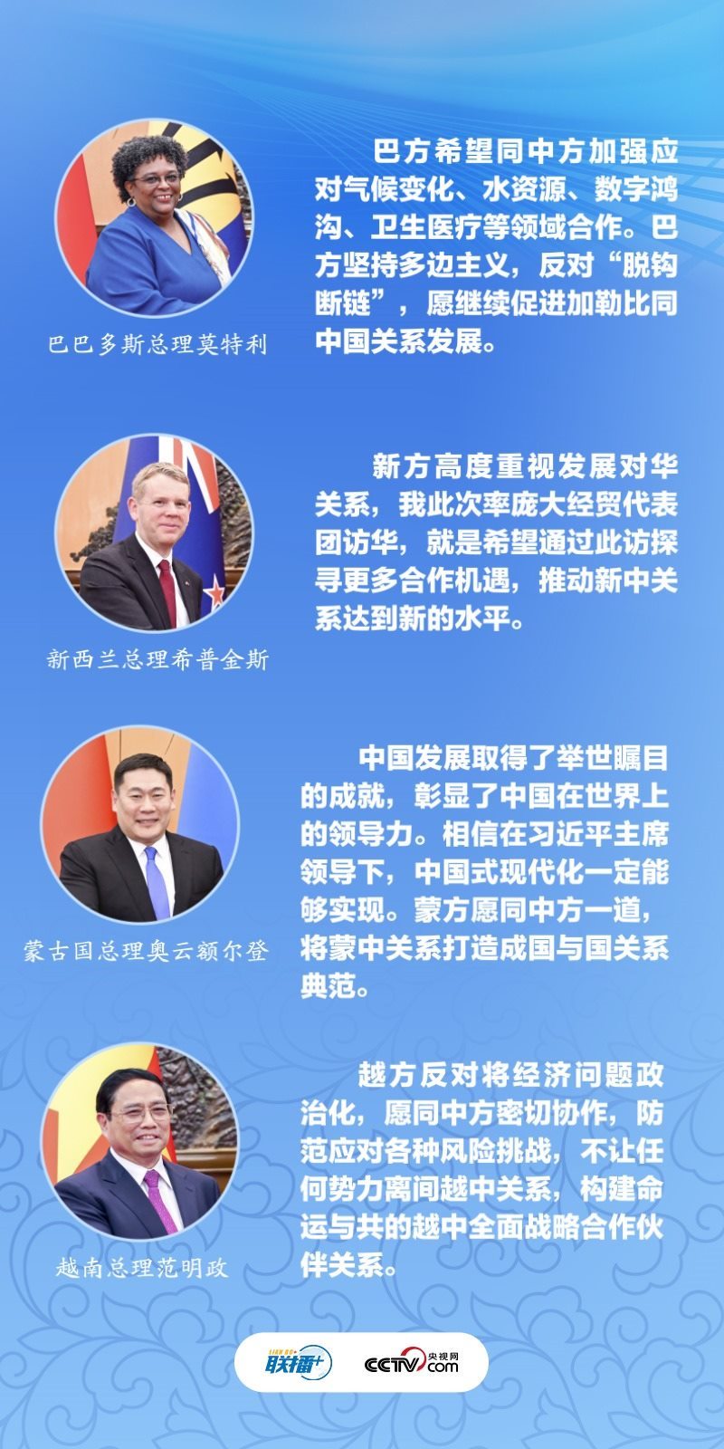 巴巴多斯總理莫特利直言“通過此訪深切感受到巴中之間的團結與友好”;蒙古國總理奧云額爾登希望“將蒙中關系打造成國與國關系典范”;越南總理范明政堅定表示“不讓任何勢力離間越中關系”;中新關系長期“領跑”中國同發(fā)達國家關系,新西蘭總理希普金斯希望此訪能進一步推動雙方合作……6月27日的四場雙邊會見中,幾位外方領導人不約而同對擴大加深雙邊合作充滿信心。