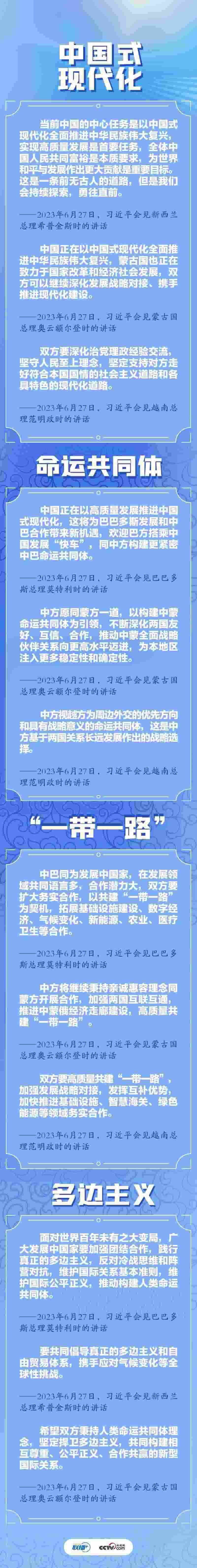 娓娓道出走和平發(fā)展的中國式現代化道路、推動中國同各有關國家構建命運共同體、指引高質量共建“一帶一路”、堅定捍衛(wèi)多邊主義……一天四場雙邊會見,四個關鍵詞讓世界看到了大國擔當。