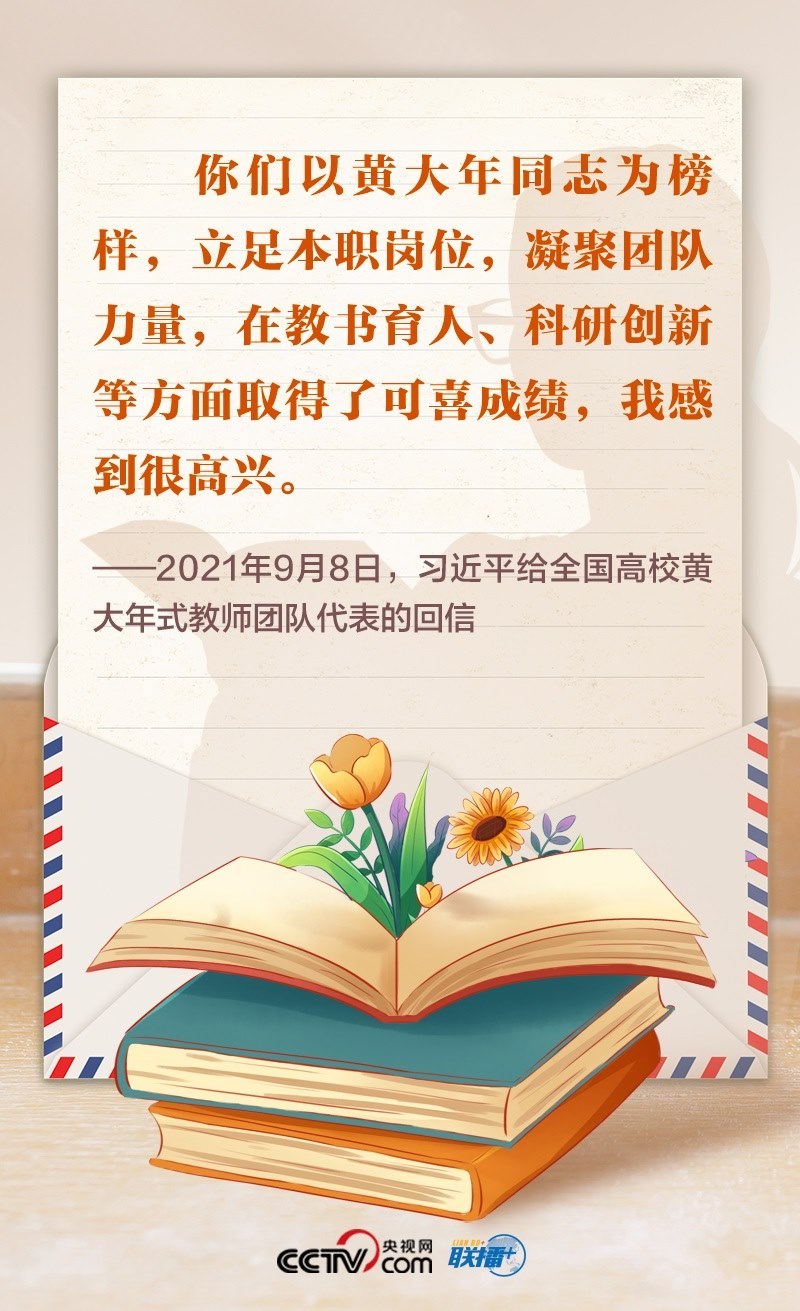 2021年,首批黃大年式教師團(tuán)隊(duì)的代表給總書記寫信,匯報(bào)教學(xué)、科研等工作情況,表達(dá)了堅(jiān)守教育報(bào)國(guó)理想、為民族復(fù)興貢獻(xiàn)力量的決心。總書記回信肯定了大家的工作成效,勉勵(lì)大家繼續(xù)學(xué)習(xí)弘揚(yáng)黃大年同志等優(yōu)秀教師的高尚精神,立德修身,潛心治學(xué),開(kāi)拓創(chuàng)新,真正把為學(xué)、為事、為人統(tǒng)一起來(lái),當(dāng)好學(xué)生成長(zhǎng)的引路人。