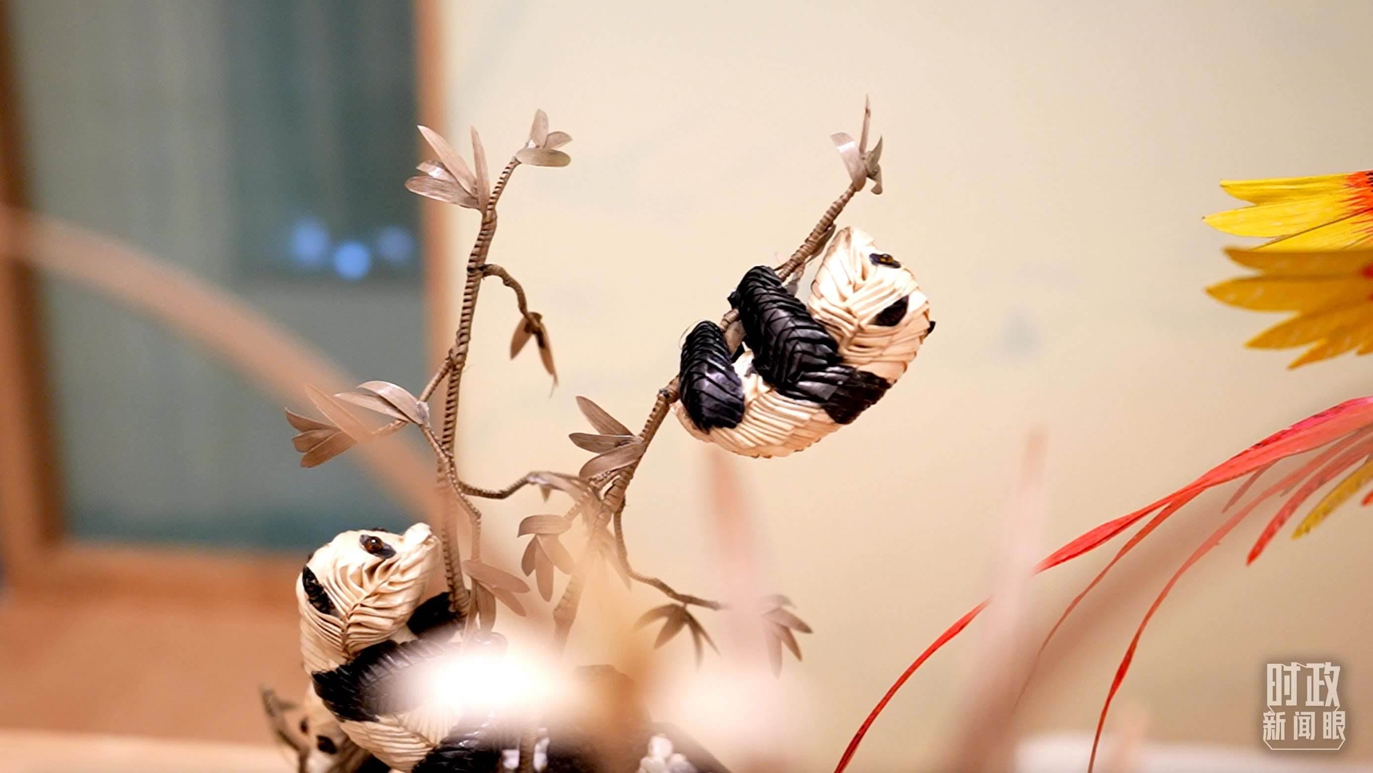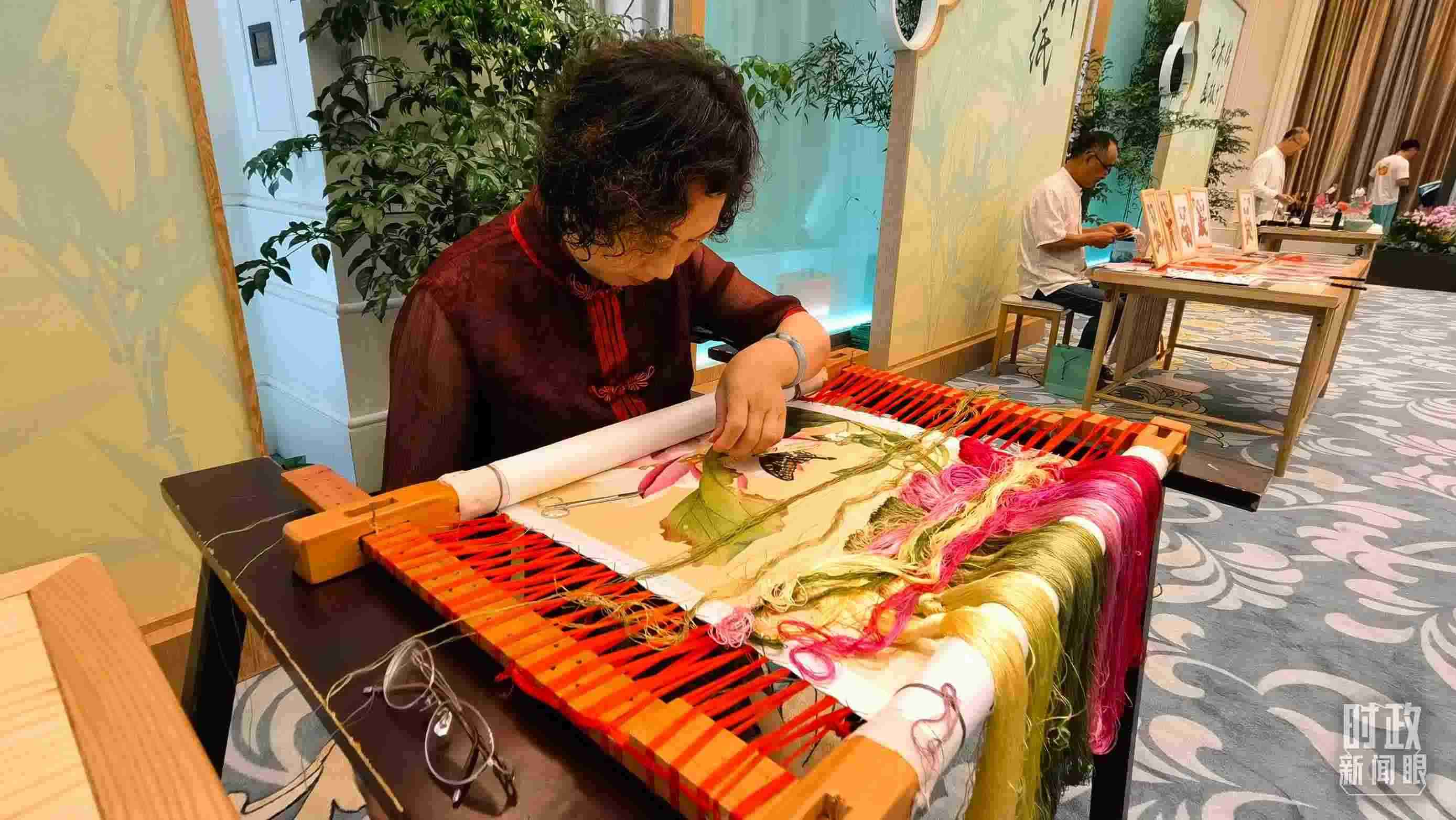 △為國際貴賓展示的四川非物質文化遺產(chǎn)棕編和蜀繡。(總臺央視記者蔣碩、韓銳拍攝)