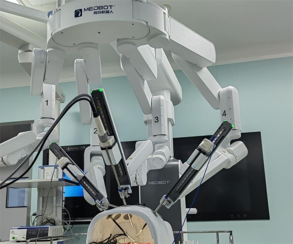 這是實施5G+AI超遠(yuǎn)程微創(chuàng)手術(shù)的四臂腔鏡機(jī)器人。(受訪者供圖)