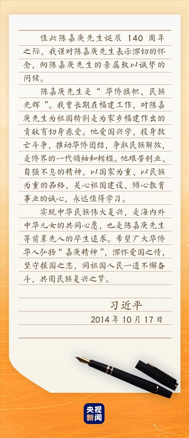 2014年10月21日,福建廈門。紀(jì)念陳嘉庚誕辰140周年座談會現(xiàn)場,雷鳴般的掌聲經(jīng)久不息。習(xí)近平總書記的回信,讓大家激動不已——