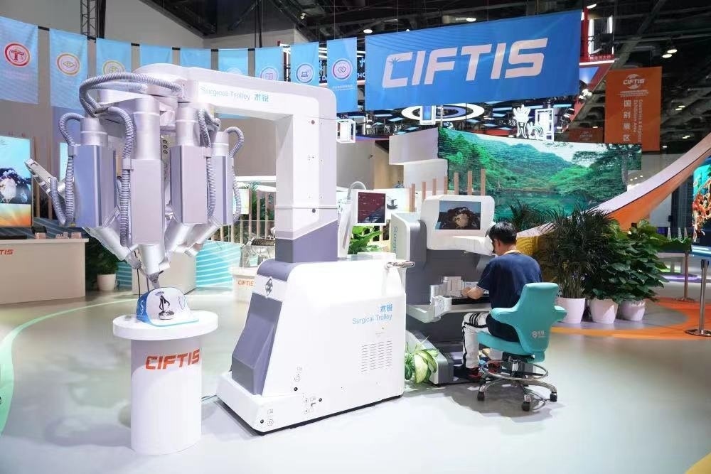 △2023年服貿(mào)會國家會議中心綜合展區(qū)展出的單孔腔鏡手術(shù)機器人