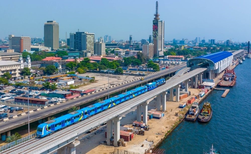 這是尼日利亞拉各斯輕軌藍線上的一列輕軌列車(2022年12月21日攝,無人機照片)。新華社發(fā)(托普·阿尤庫攝)