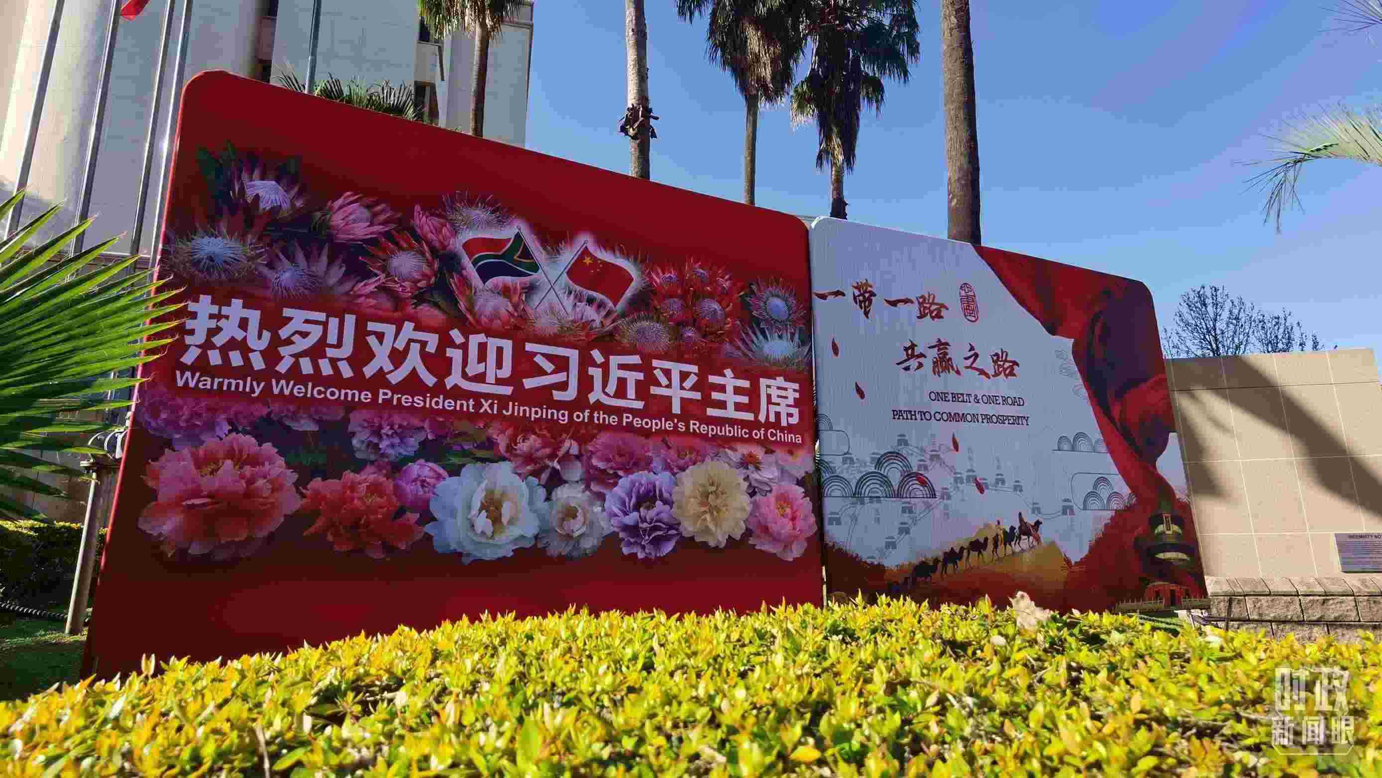 △ 2023年8月,習(xí)近平主席抵達(dá)南非約翰內(nèi)斯堡,出席金磚國家領(lǐng)導(dǎo)人第十五次會(huì)晤并對(duì)南非進(jìn)行國事訪問。圖為約翰內(nèi)斯堡街道邊“熱烈歡迎習(xí)近平主席”的標(biāo)語牌。(總臺(tái)央視記者曹亞星拍攝)