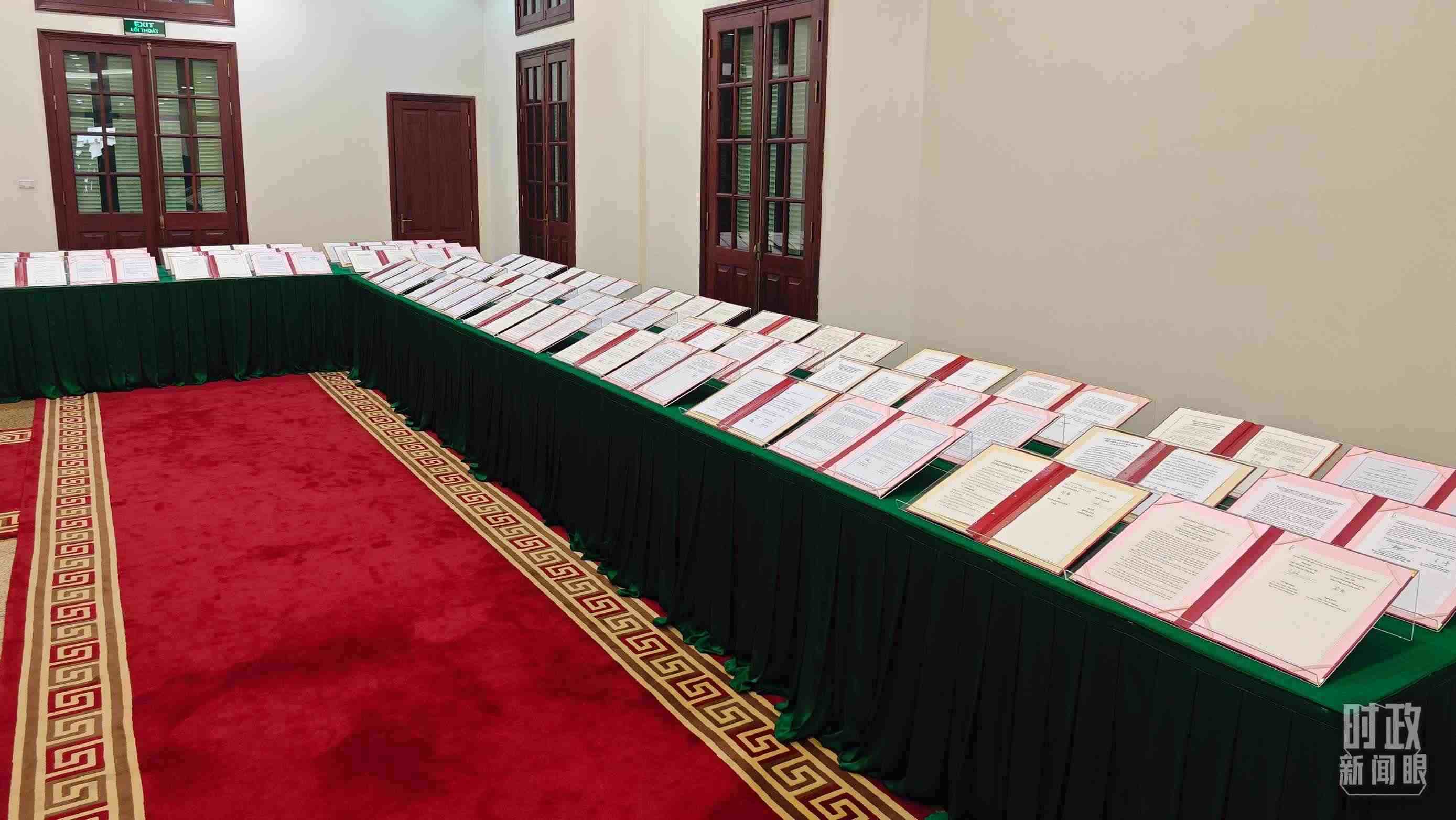 △ 2023年12月,習(xí)近平主席抵達(dá)越南河內(nèi),開啟年內(nèi)的第四次出訪。圖為中越雙方簽署的雙邊合作文件展示,涵蓋共建“一帶一路”等30多個(gè)領(lǐng)域。(總臺(tái)央視記者耿小龍拍攝)
