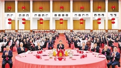 人民大會(huì)堂宴會(huì)廳燈光璀璨、喜氣洋洋,各界人士齊聚一堂、共迎新春,現(xiàn)場(chǎng)洋溢著歡樂(lè)祥和的節(jié)日氣氛。