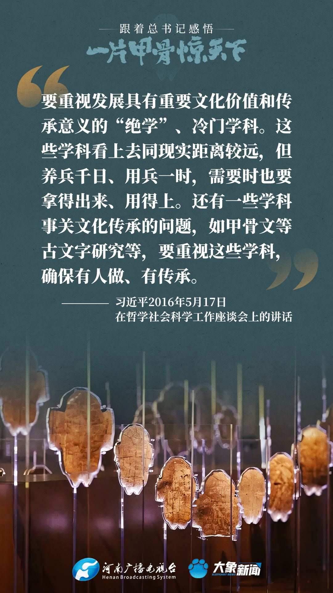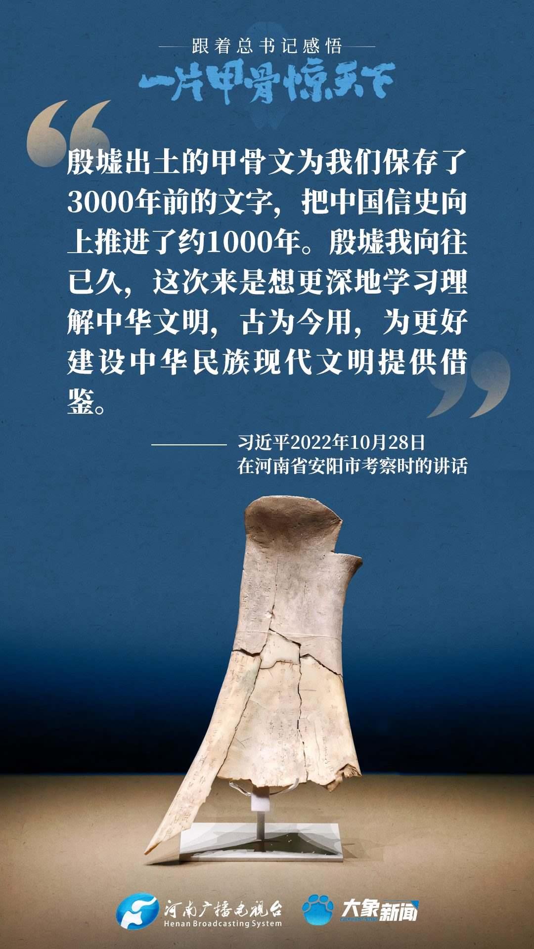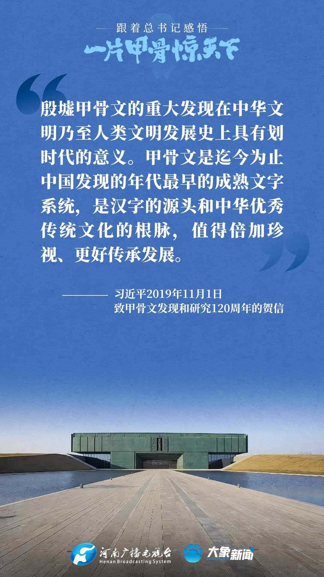 黨的十八大以來,習近平總書記多次就殷墟和甲骨文保護研究利用工作作出重要講話重要指示,為我們堅定文化自信,傳承發(fā)展中華優(yōu)秀傳統(tǒng)文化提供了根本遵循。大象新聞邀您一起回顧、學習。