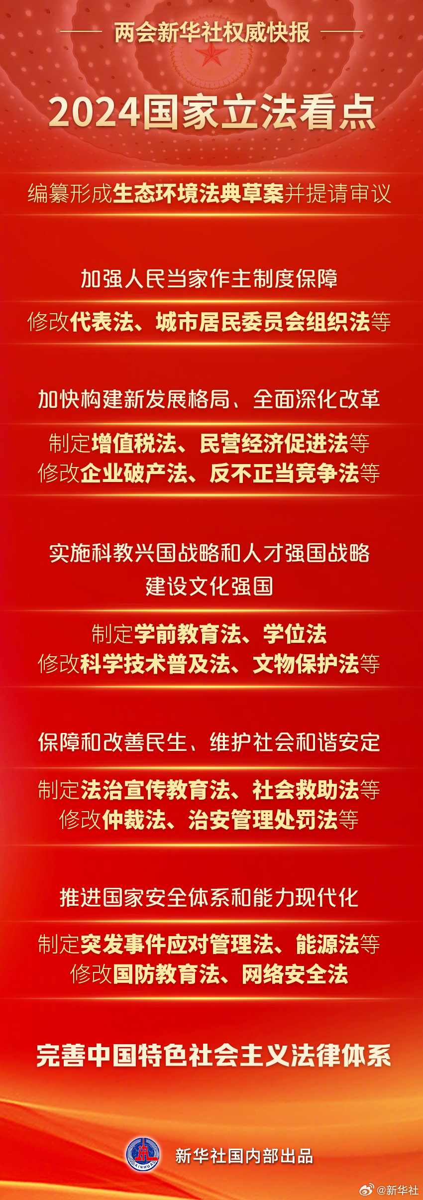 8日提請十四屆全國人大二次會議審議的全國人大常委會工作報(bào)告提出,2024年,要認(rèn)真落實(shí)常委會立法規(guī)劃,完善中國特色社會主義法律體系:制定民營經(jīng)濟(jì)促進(jìn)法、學(xué)前教育法、社會救助法等,修改城市居民委員會組織法、文物保護(hù)法、網(wǎng)絡(luò)安全法等。