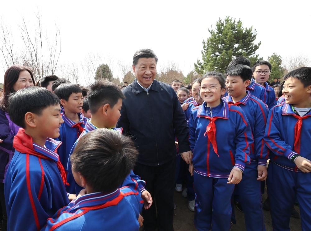2019年4月8日,習(xí)近平等黨和國家領(lǐng)導(dǎo)人來到北京市通州區(qū)永順鎮(zhèn)參加首都義務(wù)植樹活動。這是習(xí)近平同少先隊員在一起。