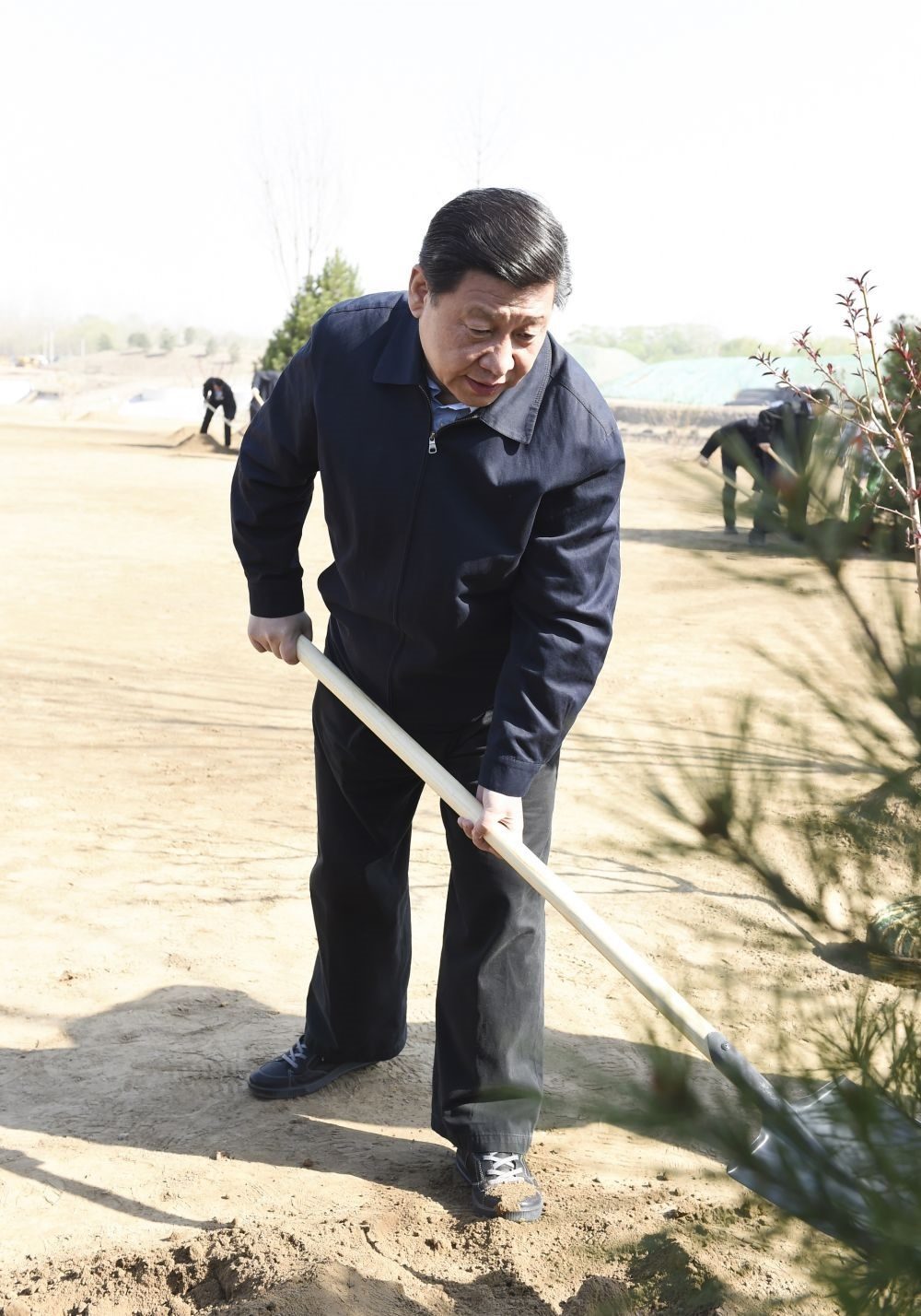 2014年4月4日,習(xí)近平等黨和國家領(lǐng)導(dǎo)人來到北京市海淀區(qū)南水北調(diào)團(tuán)城湖調(diào)節(jié)池參加首都義務(wù)植樹活動。這是習(xí)近平在植樹。