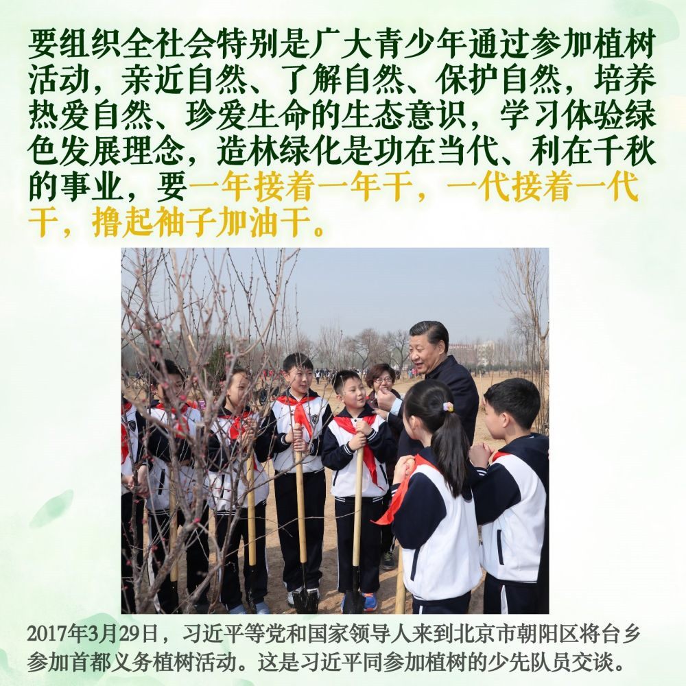 十年樹木,百年樹人。除去2020年因疫情防控考慮,每年植樹時,習(xí)總書記都要和少年兒童一起,培土澆水、談心交流。好好學(xué)習(xí),鍛煉身體,熱愛勞動,愛護(hù)環(huán)境,德智體美勞全面發(fā)展,長大后成為建設(shè)祖國的棟梁之才……習(xí)爺爺?shù)囊笠髧谕泻拖<剑钪聲r代少年兒童奮發(fā)有為、向陽成長。