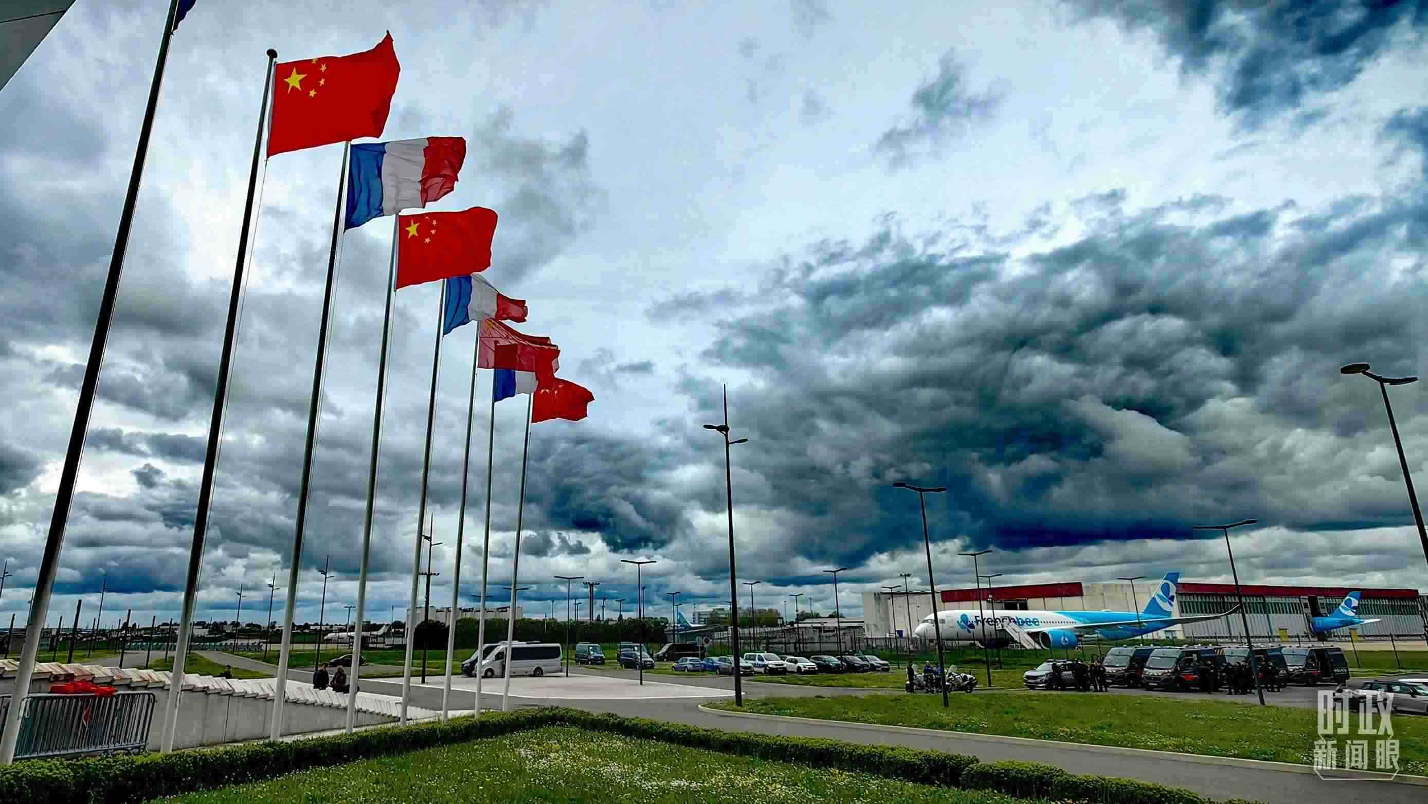 △巴黎奧利機(jī)場(chǎng),中法兩國國旗迎風(fēng)招展。(總臺(tái)央視記者段德文拍攝)