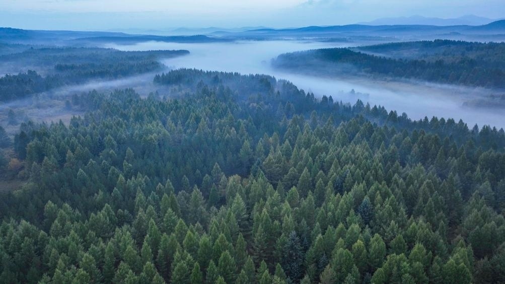 青霧繚繞的塞罕壩(無(wú)人機(jī)照片,2023年9月9日攝)。新華社發(fā)(劉滿(mǎn)倉(cāng)攝)