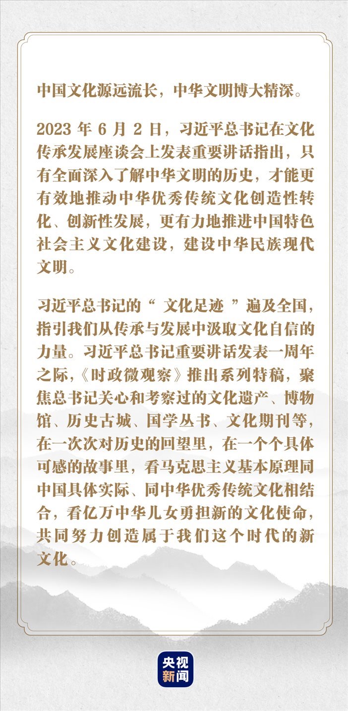 而今,我們起而行之,全面深入了解中華文明的歷史,推動中華優(yōu)秀傳統(tǒng)文化創(chuàng)造性轉(zhuǎn)化、創(chuàng)新性發(fā)展,擔(dān)負起新的文化使命。
