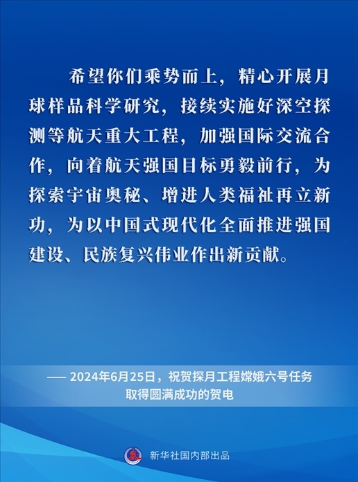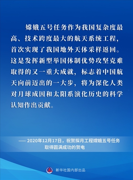 黨的十八大以來(lái),在以習(xí)近平同志為核心的黨中央關(guān)心引領(lǐng)下,中國(guó)探月工程取得舉世矚目的重大成就,為探索宇宙奧秘、增進(jìn)人類福祉屢立新功,為以中國(guó)式現(xiàn)代化全面推進(jìn)強(qiáng)國(guó)建設(shè)、民族復(fù)興偉業(yè)作出卓越貢獻(xiàn)。