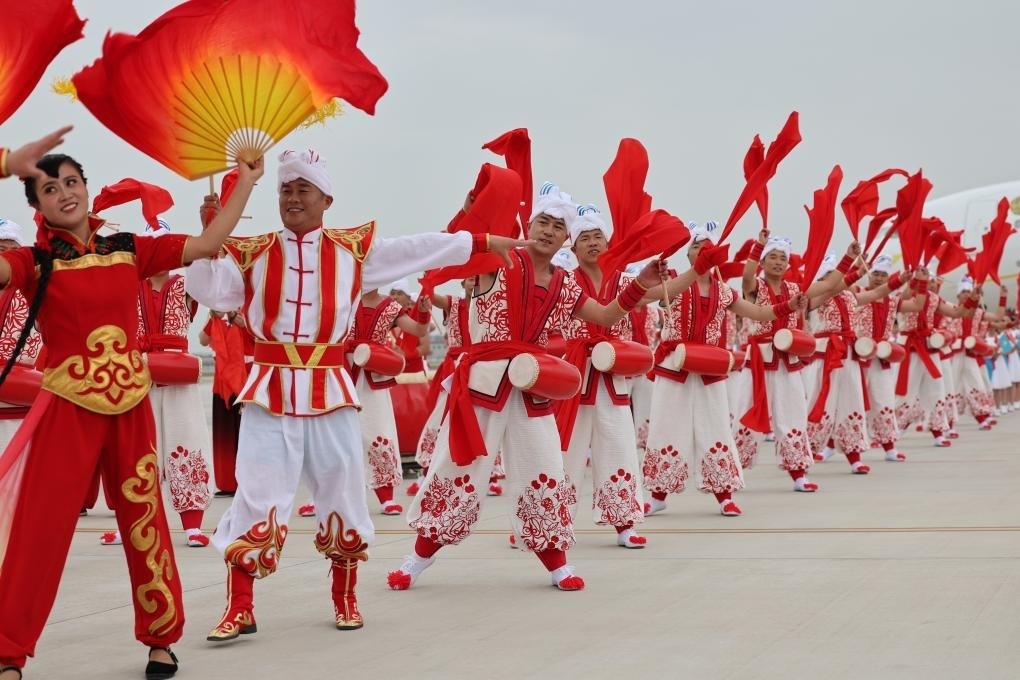 2023年5月17日下午,出席中國(guó)-中亞峰會(huì)的哈薩克斯坦總統(tǒng)托卡耶夫抵達(dá)陜西省西安市。當(dāng)?shù)孛癖娨詿崆榈难?、歡快的秧歌等民間藝術(shù)表演歡迎貴賓到來(lái)。新華社記者 邢廣利 攝