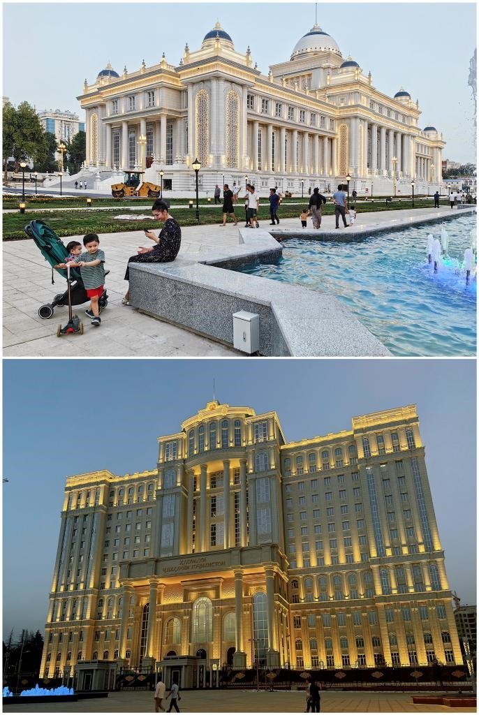 6月29日,在塔吉克斯坦首都杜尚別,人們?cè)谧h會(huì)大樓和政府大樓前散步。(拼版照片)。