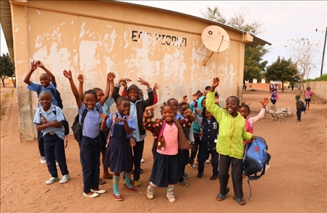 △2023年7月25日,莫桑比克馬普托省皮科科村學(xué)校的孩子們站在裝有中國(guó)援助的衛(wèi)星電視接收天線的房屋前。