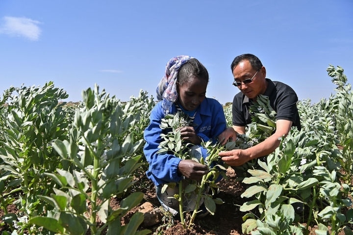 2023年9月27日,在位于厄立特里亞阿斯馬拉的農(nóng)業(yè)技術(shù)援助項目示范地,中國援厄第三期高級農(nóng)業(yè)專家組豆類作物專家劉運民(右)指導(dǎo)當?shù)剞r(nóng)戶進行蠶豆作物的田間管理。新華社記者 韓旭 攝