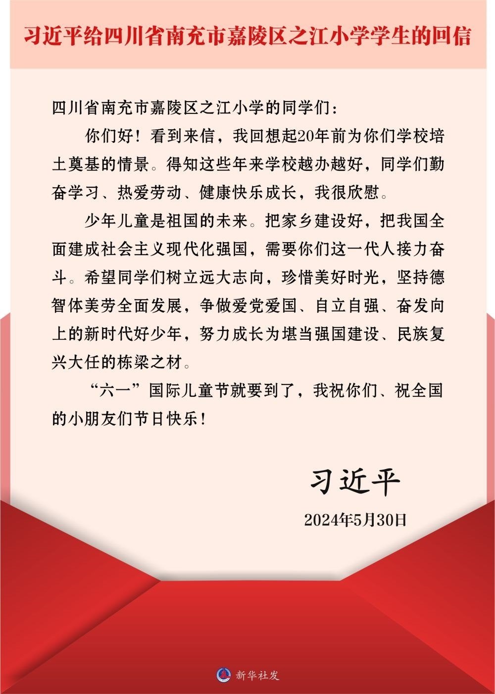 今年"六一"前夕,習近平總書記給之江小學的學生們回信:"得知這些年來學校越辦越好,同學們勤奮學習、熱愛勞動、健康快樂成長,我很欣慰。"他勉勵同學們爭做愛黨愛國、自立自強、奮發(fā)向上的新時代好少年,努力成長為堪當強國建設、民族復興大任的棟梁之材。