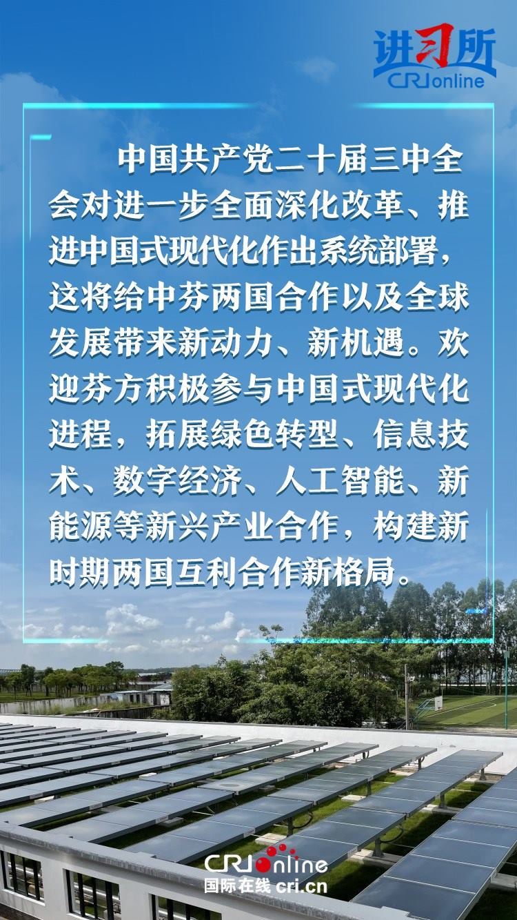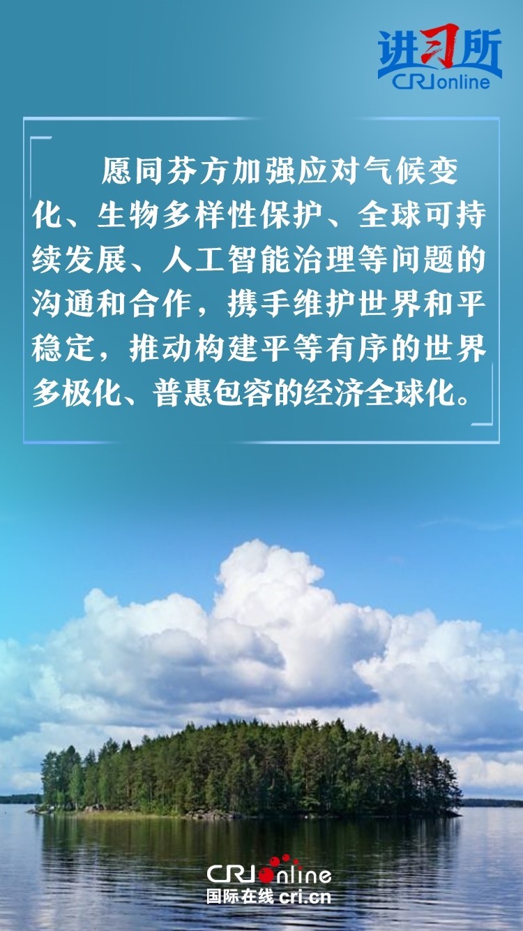 習近平指出,建交以來,中芬始終友好相處、互尊互信,樹立了國與國之間超越歷史、文化、制度差異,平等交往的典范。中方愿同芬方一道,加強戰(zhàn)略合作,弘揚友好傳統(tǒng),將中芬面向未來的新型合作伙伴關系進一步推向前進,更好造福兩國和兩國人民,為世界和平和發(fā)展作出新貢獻。