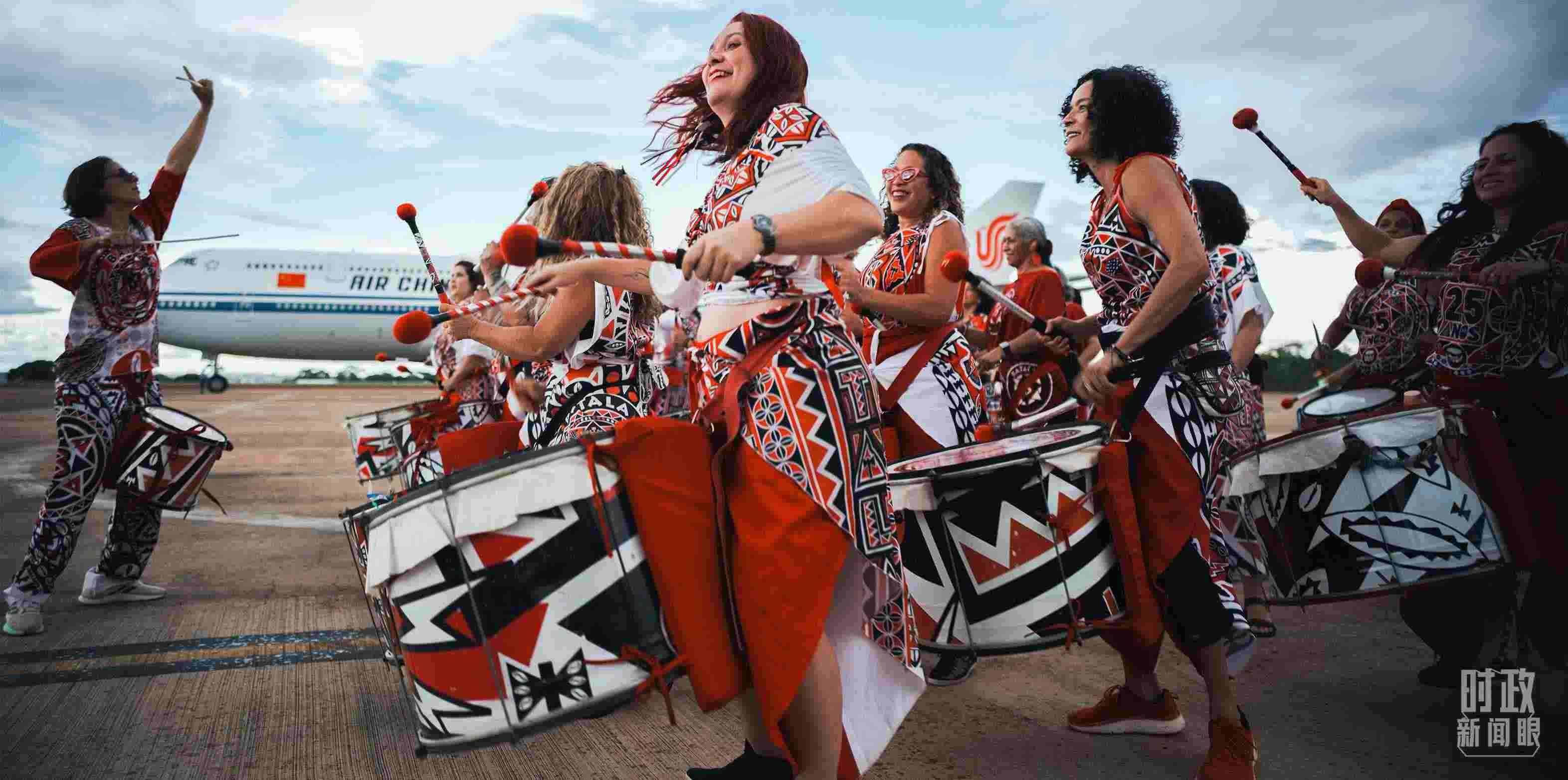 △習(xí)主席乘專機(jī)抵達(dá)巴西利亞,藝術(shù)家演奏特色鼓樂。(總臺央視記者彭漢明拍攝)