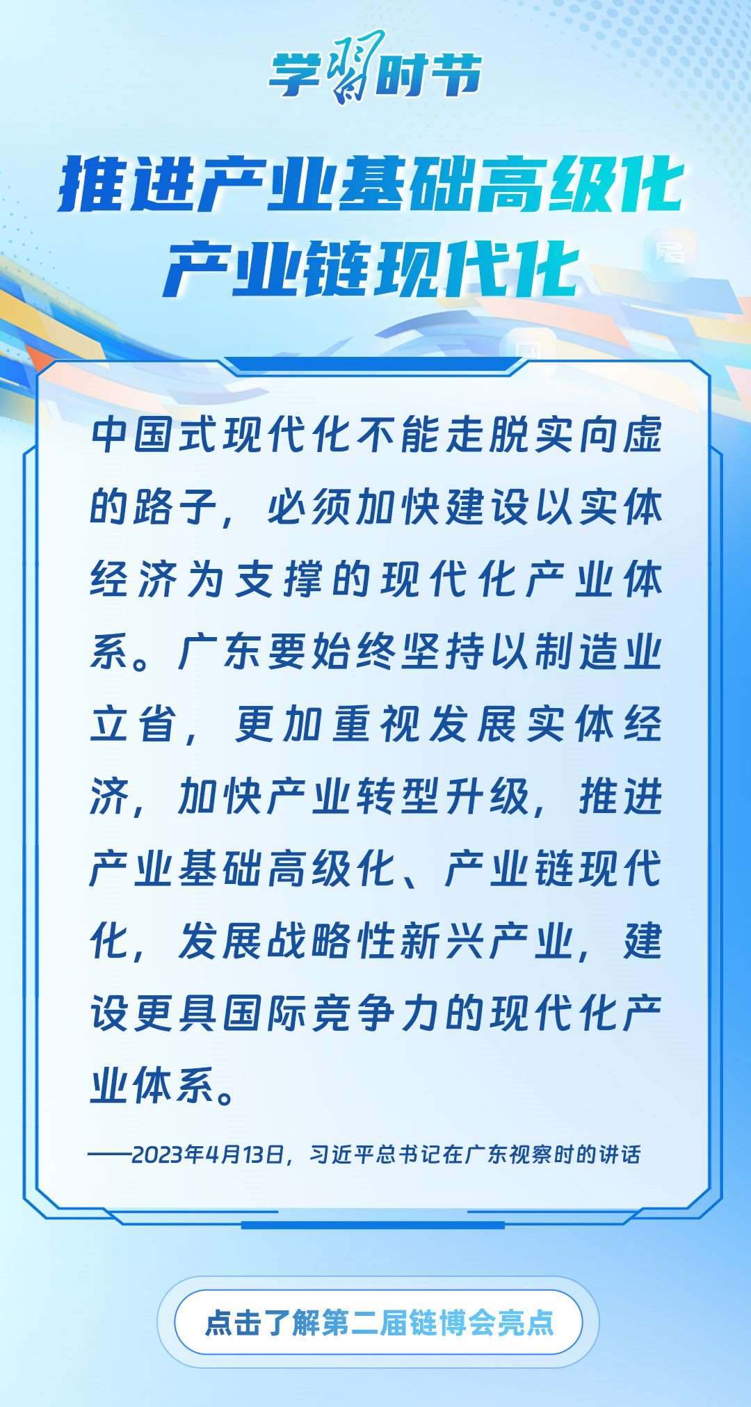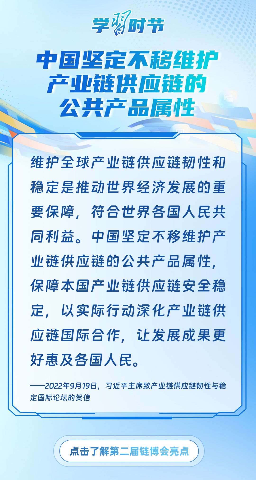 習(xí)近平主席心系產(chǎn)業(yè)鏈供應(yīng)鏈安全穩(wěn)定,多次強調(diào)中國將以實際行動維護(hù)全球產(chǎn)業(yè)鏈供應(yīng)鏈安全穩(wěn)定,為世界各國共同構(gòu)筑安全穩(wěn)定、暢通高效、開放包容、互利共贏的全球產(chǎn)業(yè)鏈供應(yīng)鏈體系提供中國方案。習(xí)近平主席曾在多個重要場合對此作出一系列深刻闡述,讓我們一起學(xué)習(xí)。