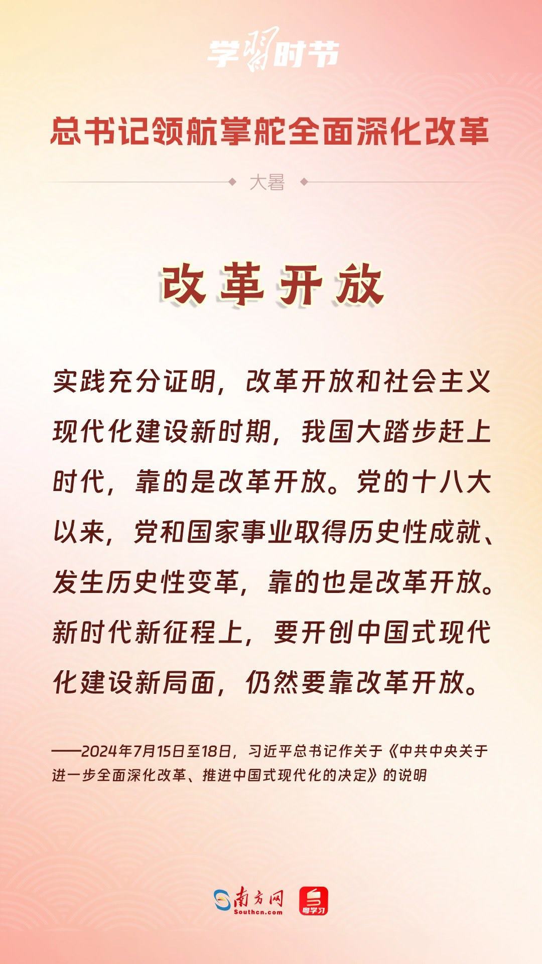 我們隆重慶祝新中國成立75周年,深情回望共和國的滄桑巨變。從五千多年中華文明的傳承中一路走來,“中國”二字鐫刻在“何尊”底部,更銘刻在每個華夏兒女心中。黨的二十屆三中全會勝利召開,吹響進(jìn)一步全面深化改革的號角。我們乘著改革開放的時代大潮闊步前行,中國式現(xiàn)代化必將在改革開放中開辟更加廣闊的前景。