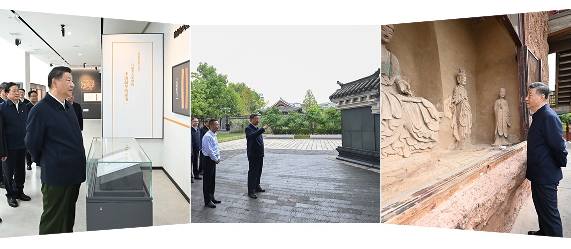 △ 自左向右分別為:2024年11月4日,習(xí)近平總書記在湖北孝感云夢縣博物館參觀出土秦漢簡牘展;2024年10月17日,習(xí)近平總書記在安徽桐城六尺巷考察;2024年9月11日,習(xí)近平總書記在甘肅天水麥積山石窟考察。