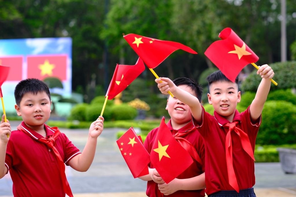 主席府廣場上,五星紅旗同金星紅旗迎風飄揚,200多名越南少年兒童揮舞旗幟,熱烈歡迎習近平到訪。